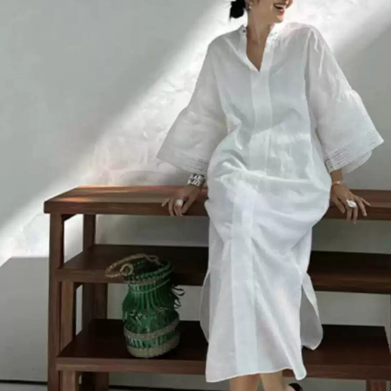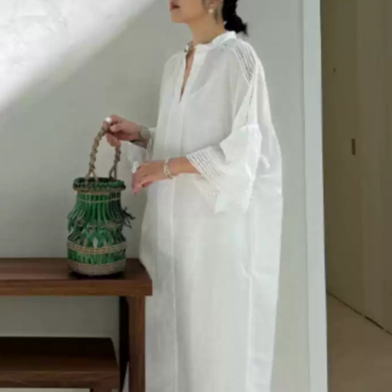 軽やかで涼しげなホワイトのシャツワンピース。ボリュームのある七分丈のフレアスリーブが女性らしさを引き立て、1枚でさらりと着てもおしゃれに決まるデザイン。リゾートやバカンスはもちろん、タウンユースにもぴったり。リラックス感ときちんと感を両立した大人の夏ワンピースです。