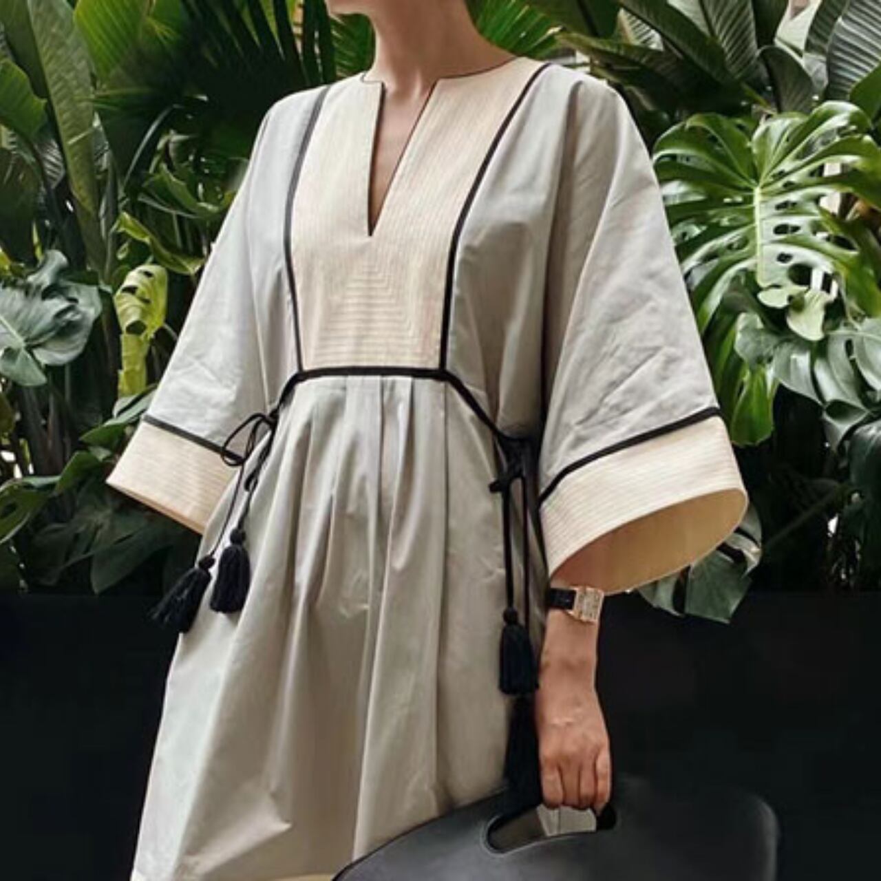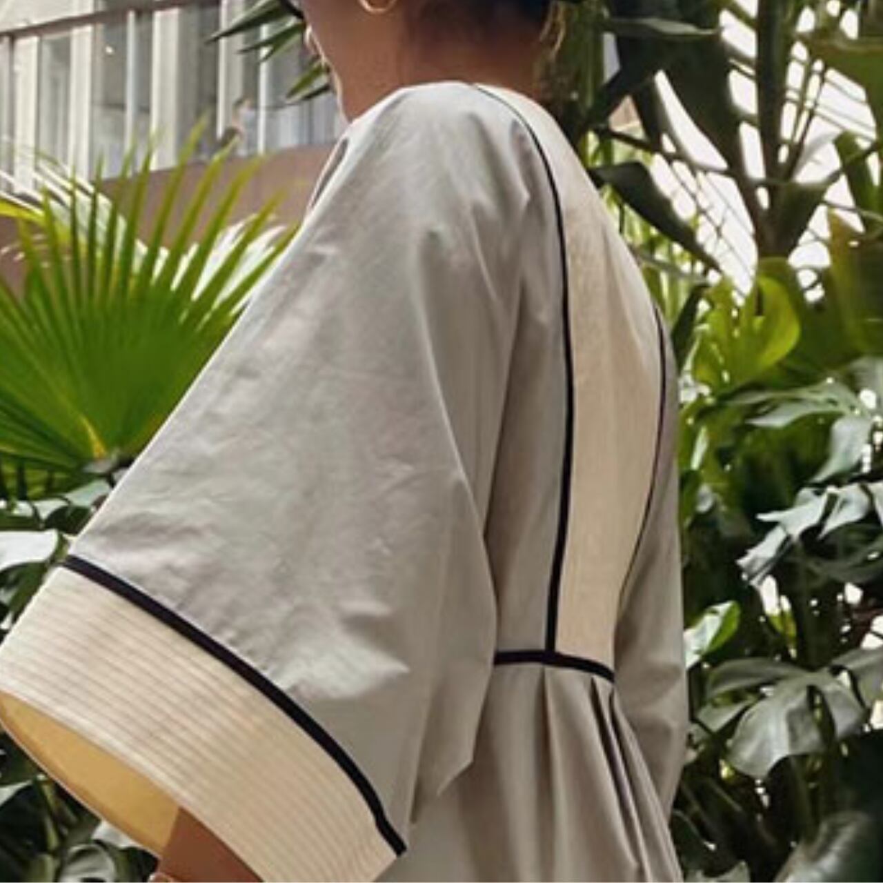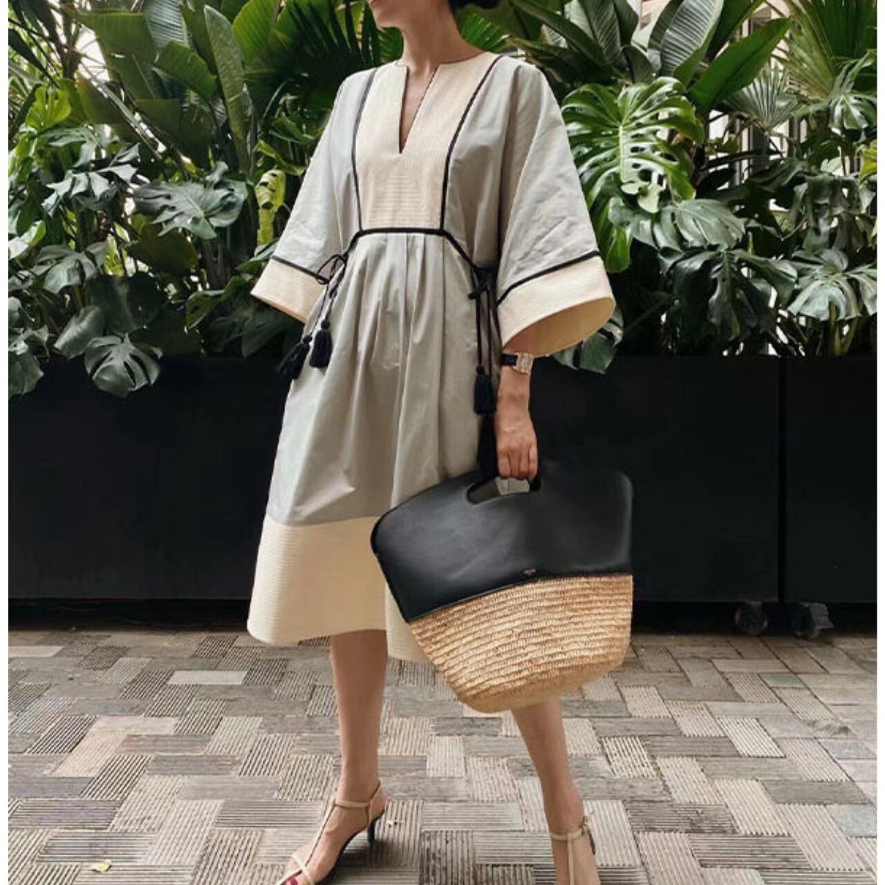 メリハリの効いたバイカラーデザインが目を引くVネックワンピース。たっぷりとした袖とウエストのドローストリングが立体的なシルエットを演出し、抜け感のあるエレガントスタイルに。さらりとした着心地で、リゾートや街歩きにもぴったりの一着です。