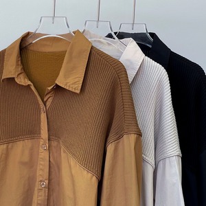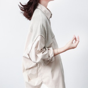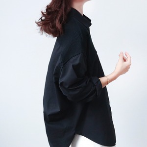 ニットライクな異素材切替が目を惹くルーズシャツ。肩から袖にかけて立体感のあるリブ切替を施し、シンプルながらモードな印象をプラス。ゆったりとしたシルエットとドロップショルダーでこなれ感たっぷりに着こなせる一枚。前後差のある着丈で、アウトスタイルもバランス良く決まります。