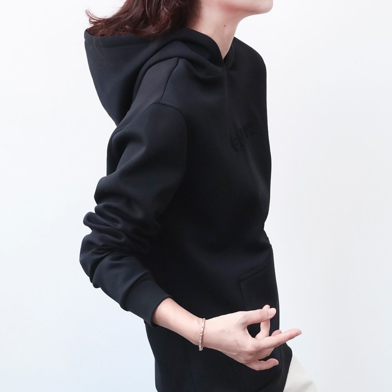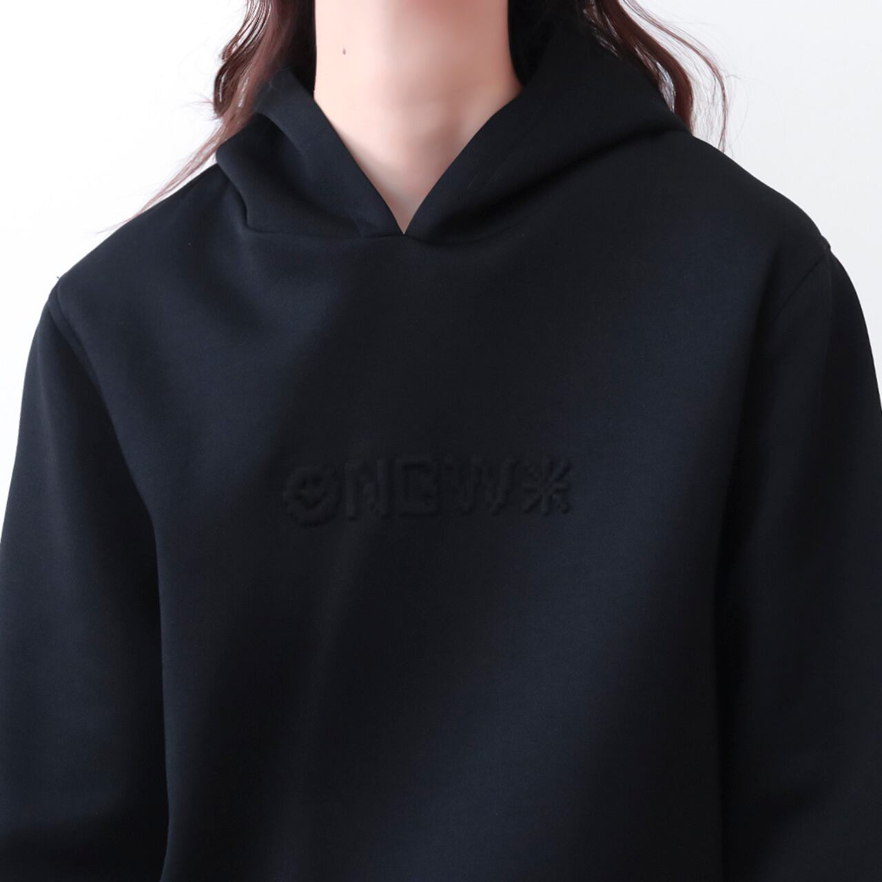 上質素材を使用したフーディー。75%の高含量コットンによる柔らかくしっかりとした手触りに、インポート機で圧着した立体ロゴ加工が施され、見た目にも質感にも圧倒的な高級感を与えます。厚みとハリのある仕立てで型崩れしにくく、カジュアルでありながら洗練された一枚。