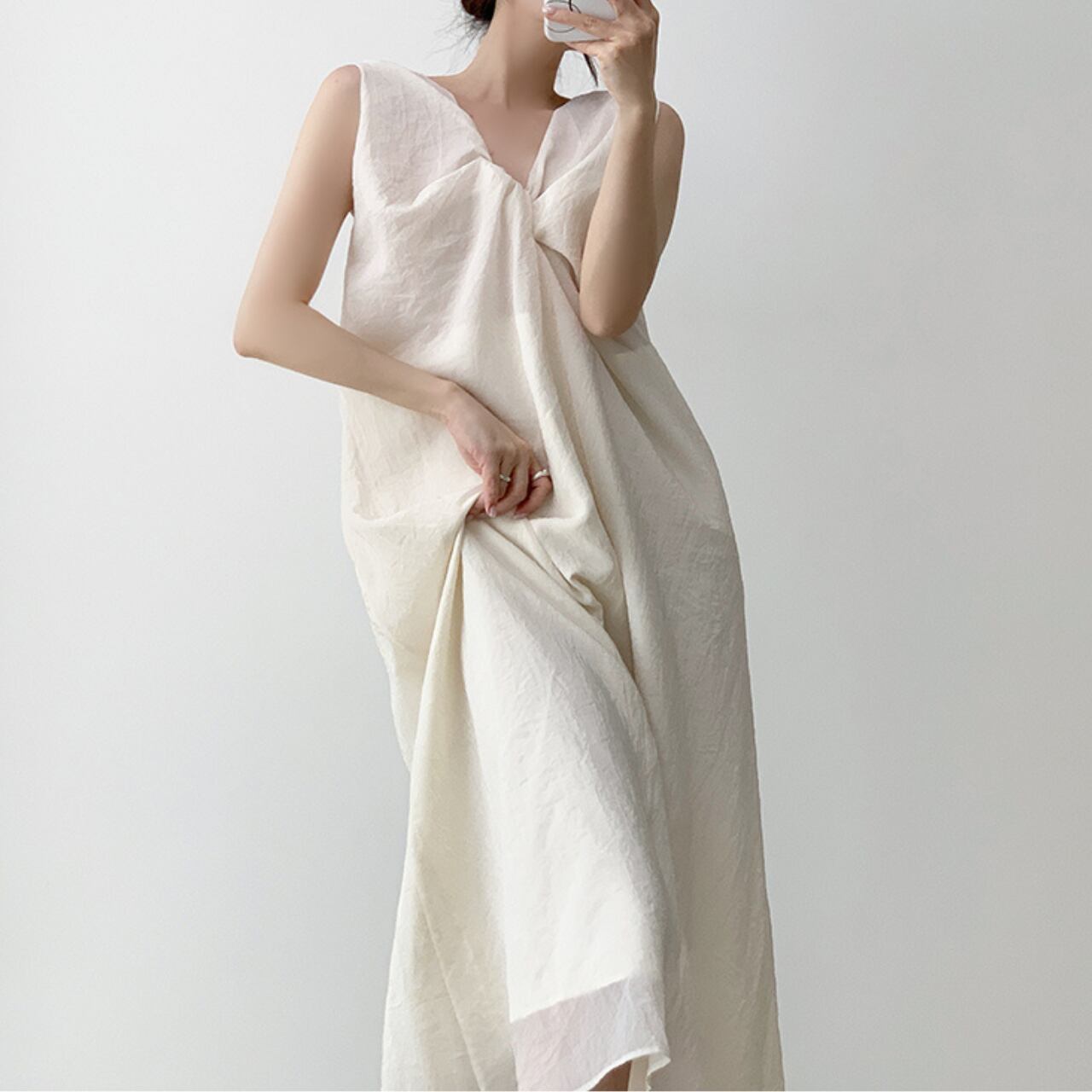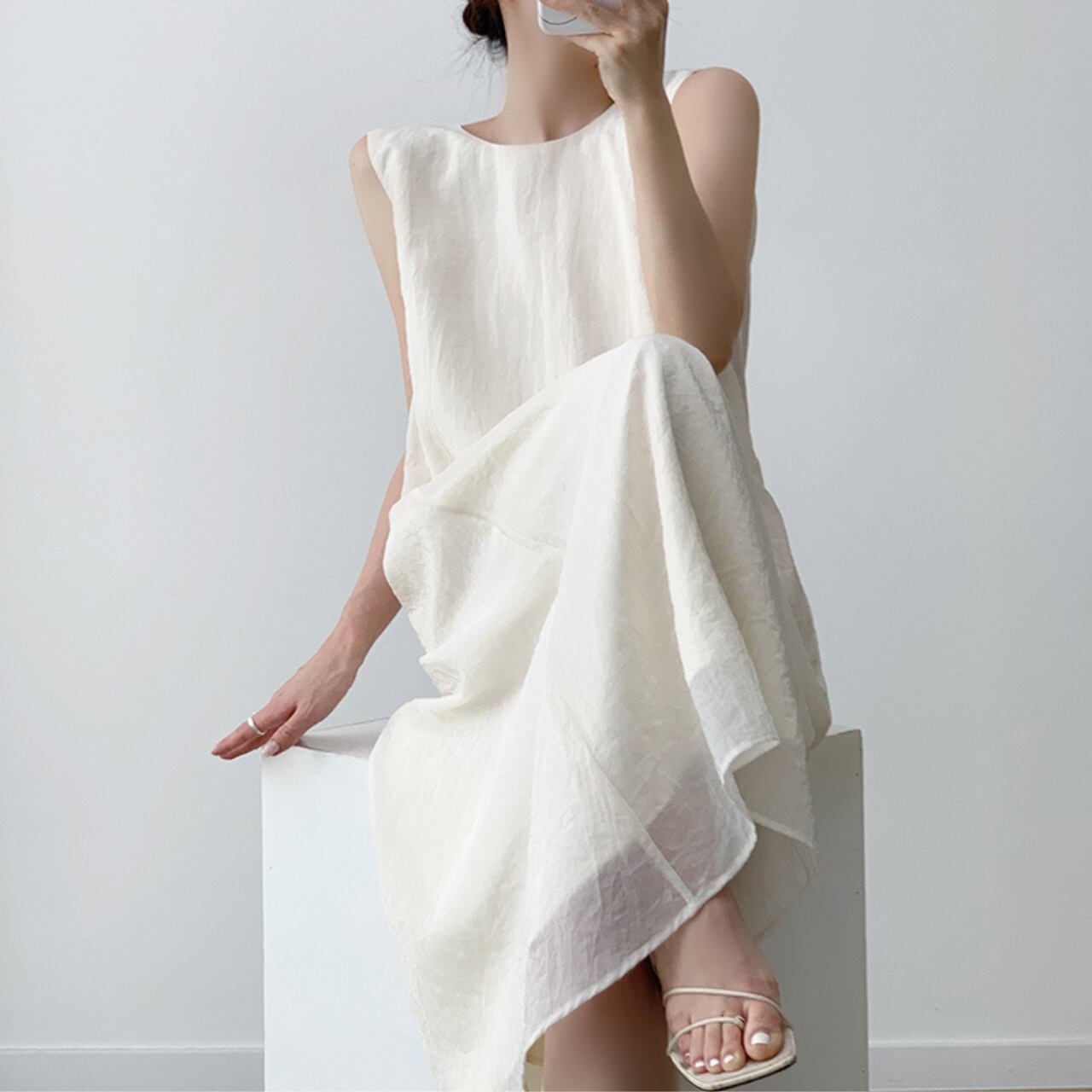 #シンプルワンピース #シボ加工 #ノースリーブワンピ #ナチュラルコーデ #大人カジュアル #軽やか素材