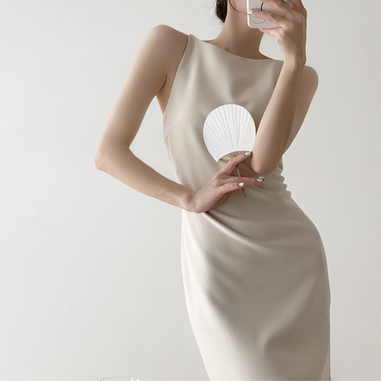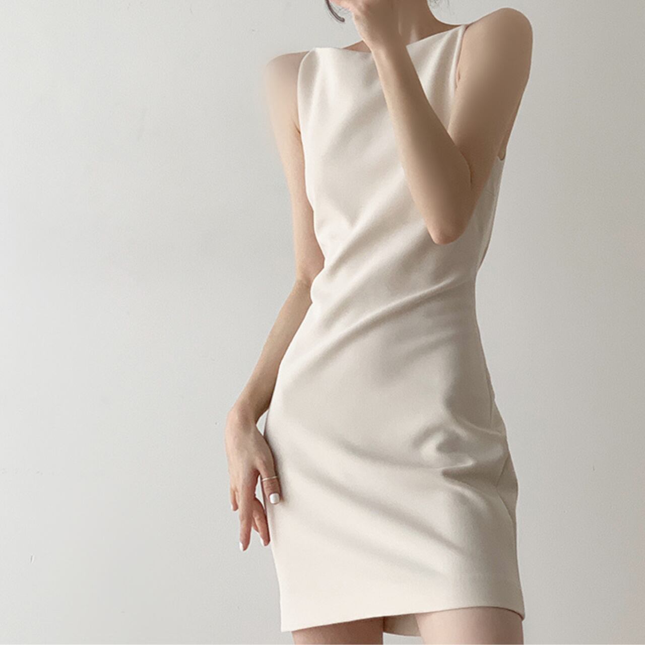 エレガントなミニマルデザインが魅力のノースリーブタイトワンピース。計算されたシルエットでボディラインを美しく引き立て、女性らしさを最大限に演出します。デートやお食事、ちょっとしたパーティーにもぴったりの一着です。