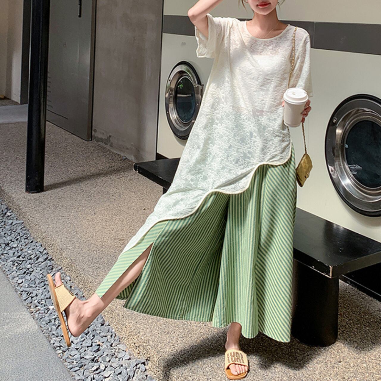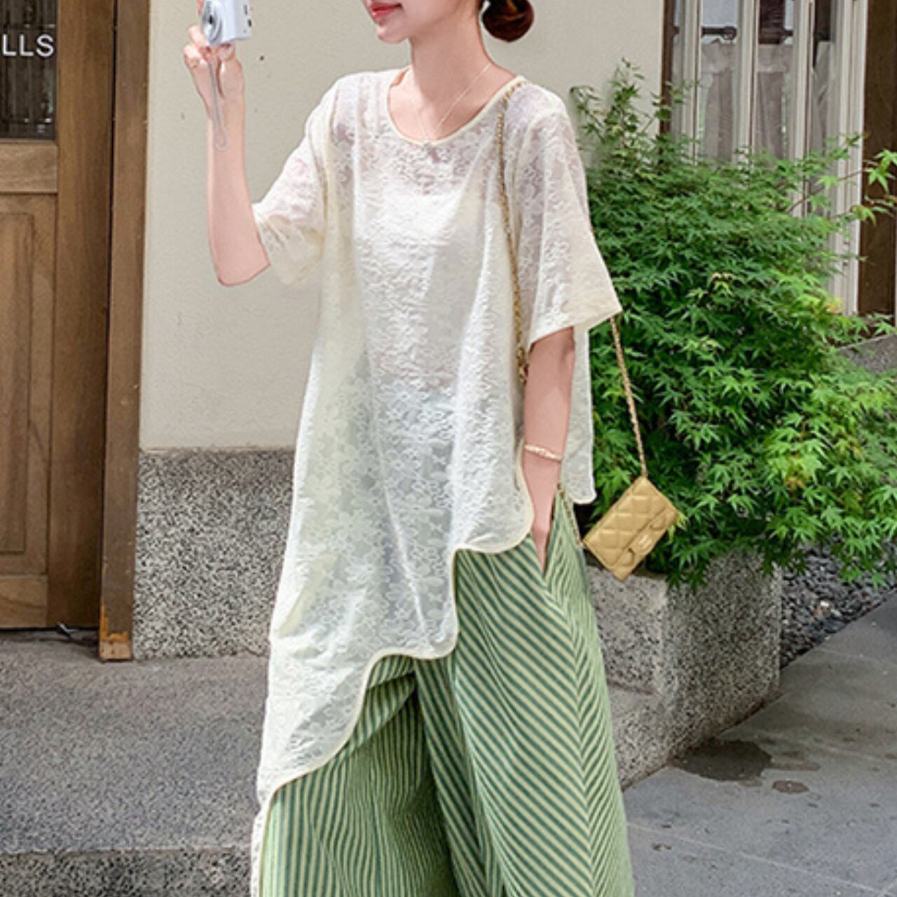 上品な透け感が魅力のレーストップスと、脚長効果が嬉しいストライプ柄のワイドパンツのセットアップ。トップスはアシンメトリーなカットが動きのある印象を与え、繊細なレースが女性らしさを引き立てます。パンツはゆったりとしたシルエットで、快適な穿き心地とスタイルアップを両立。上下セットで着るだけでコーデが完成し、抜け感とトレンド感を演出してくれます。