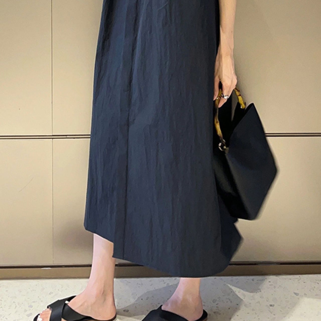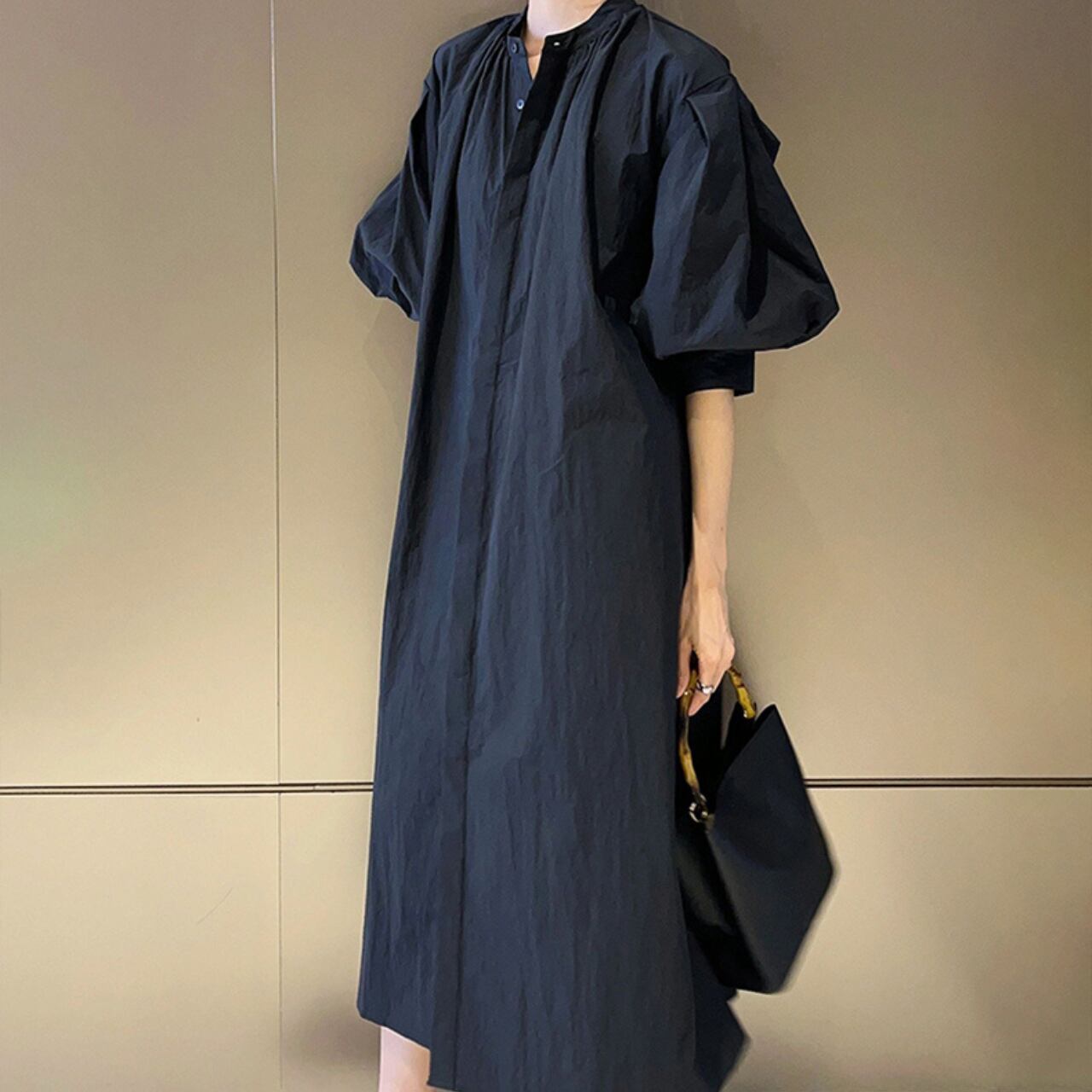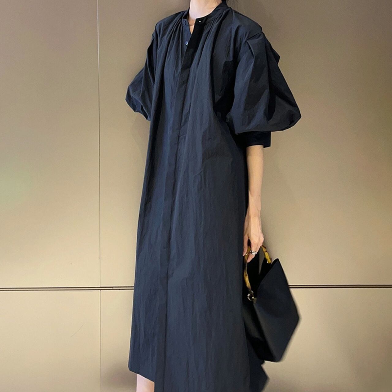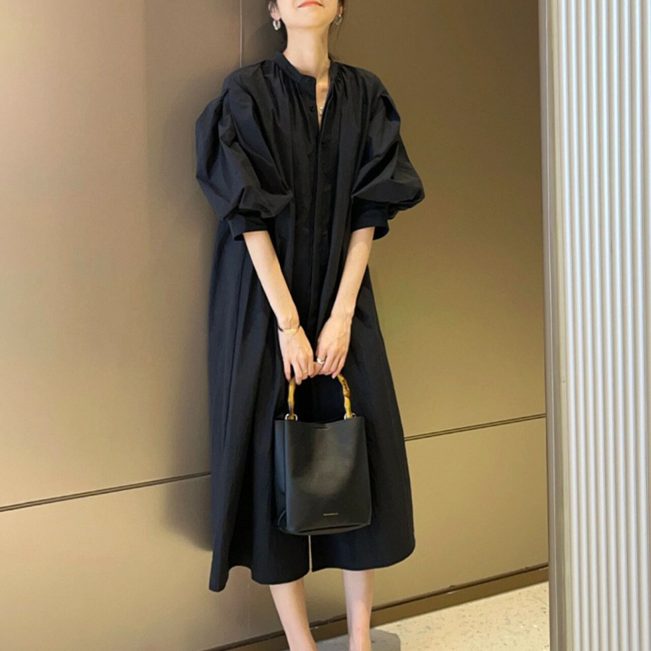 立体的なパフスリーブが印象的なコットンワンピース。程よいハリ感のある生地がシルエットを美しく保ち、シンプルながら存在感のあるスタイルを演出します。前立てのスナップボタンとフロントスリットが程よい抜け感をプラス。カジュアルにもモードにも着回せる、洗練された一枚です。