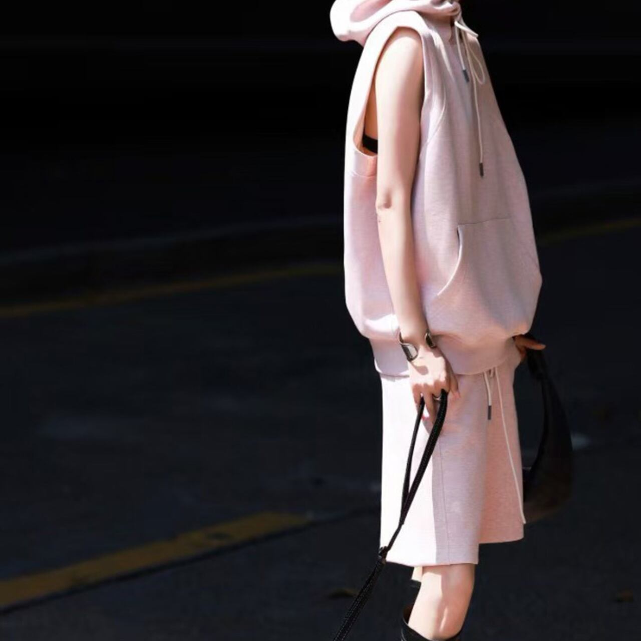 ストリート感漂うノースリーブパーカーとショートパンツのセットアップ。程よくルーズなシルエットがこなれ感を演出しつつ、スポーティで抜け感のある印象に。フードやドローストリング、サイドポケットなど、実用性とデザイン性を兼ね備えた一着。ハイヒールブーツなどを合わせてエレガントミックスにも◎。