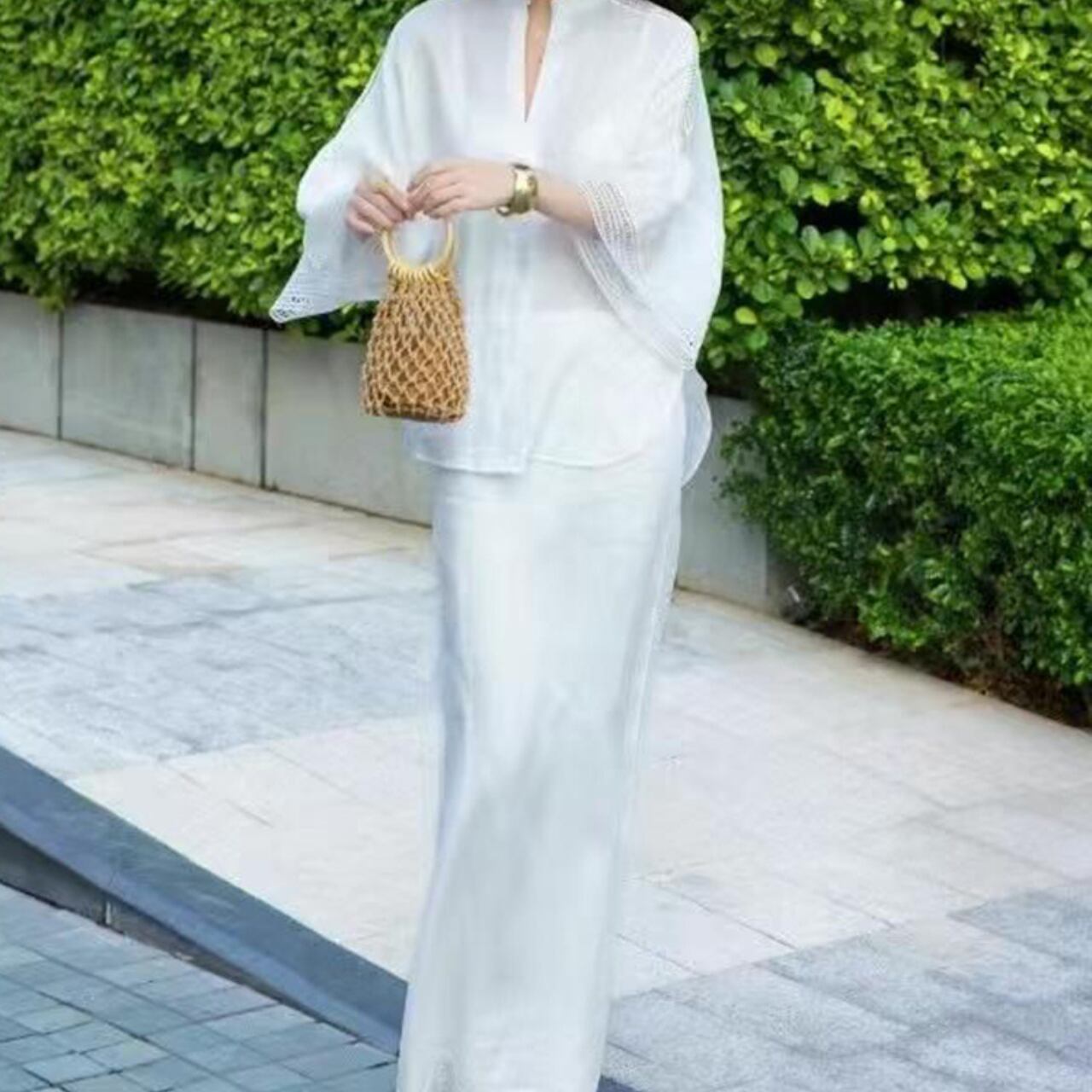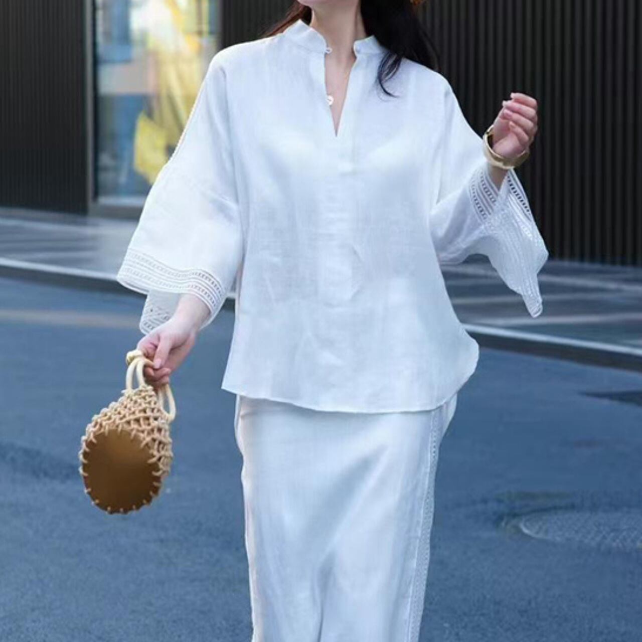 #リネン風素材 #セットアップ #フレアスリーブ #レースディテール #リゾートコーデ #ホワイトコーデ