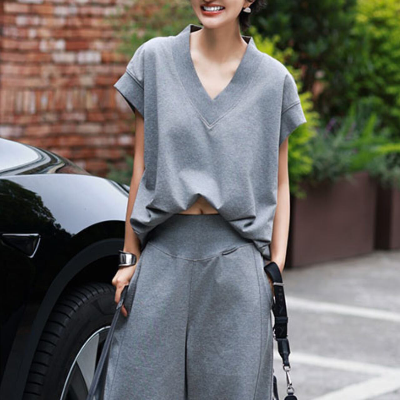 大人のこなれ感漂う、Vネックショートスリーブとワイドパンツのセットアップ。