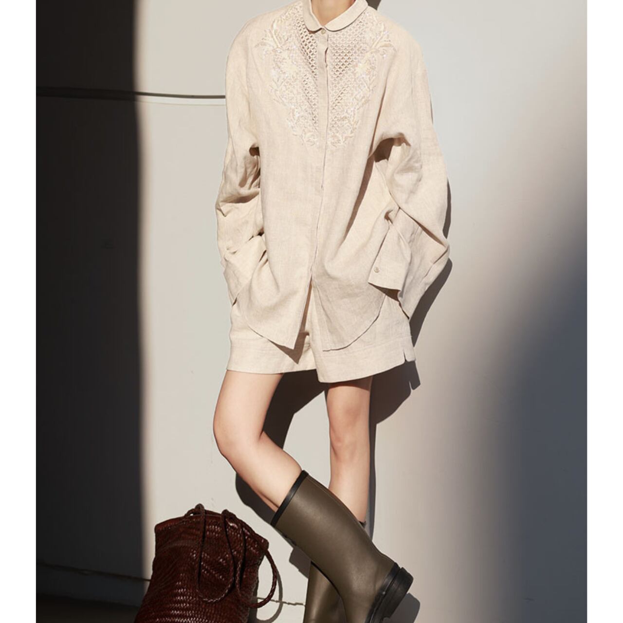 ナチュラルな風合いのリネン素材に、繊細な刺繍とレースの切り替えが印象的なセットアップ。ゆったりとしたシルエットでリラックス感がありながら、上品なディテールが大人の抜け感スタイルを演出。シャツとしても羽織としても着用できるデザインで、セットでも単品使いでも楽しめます。