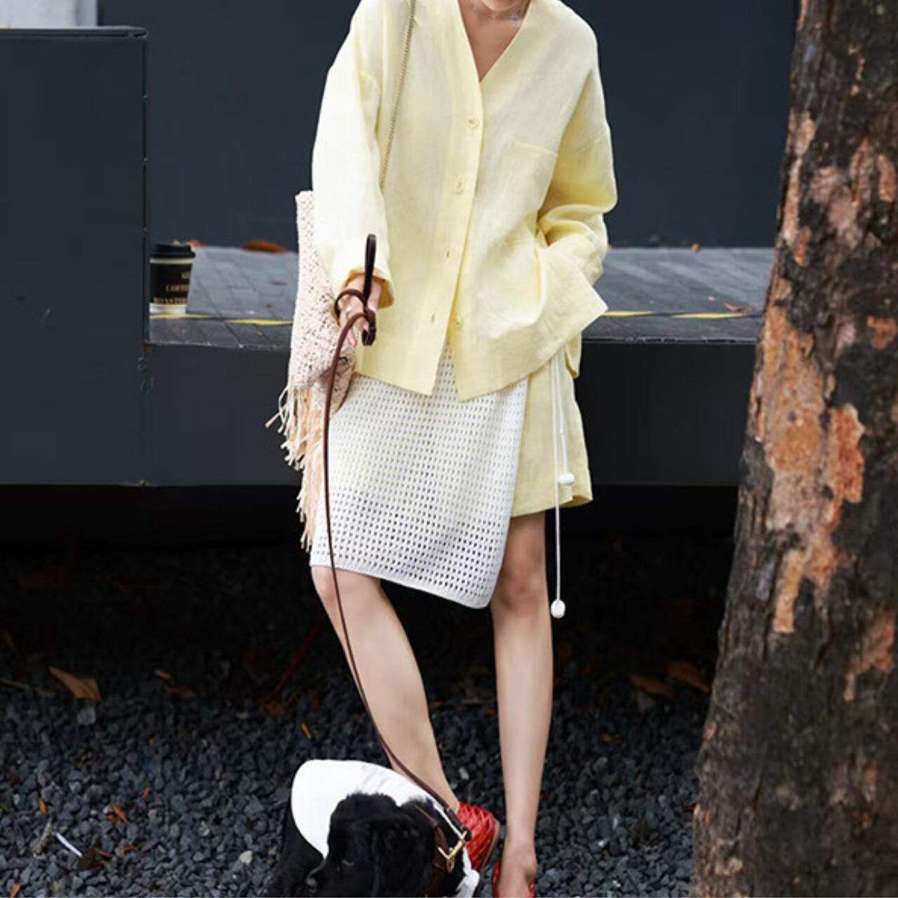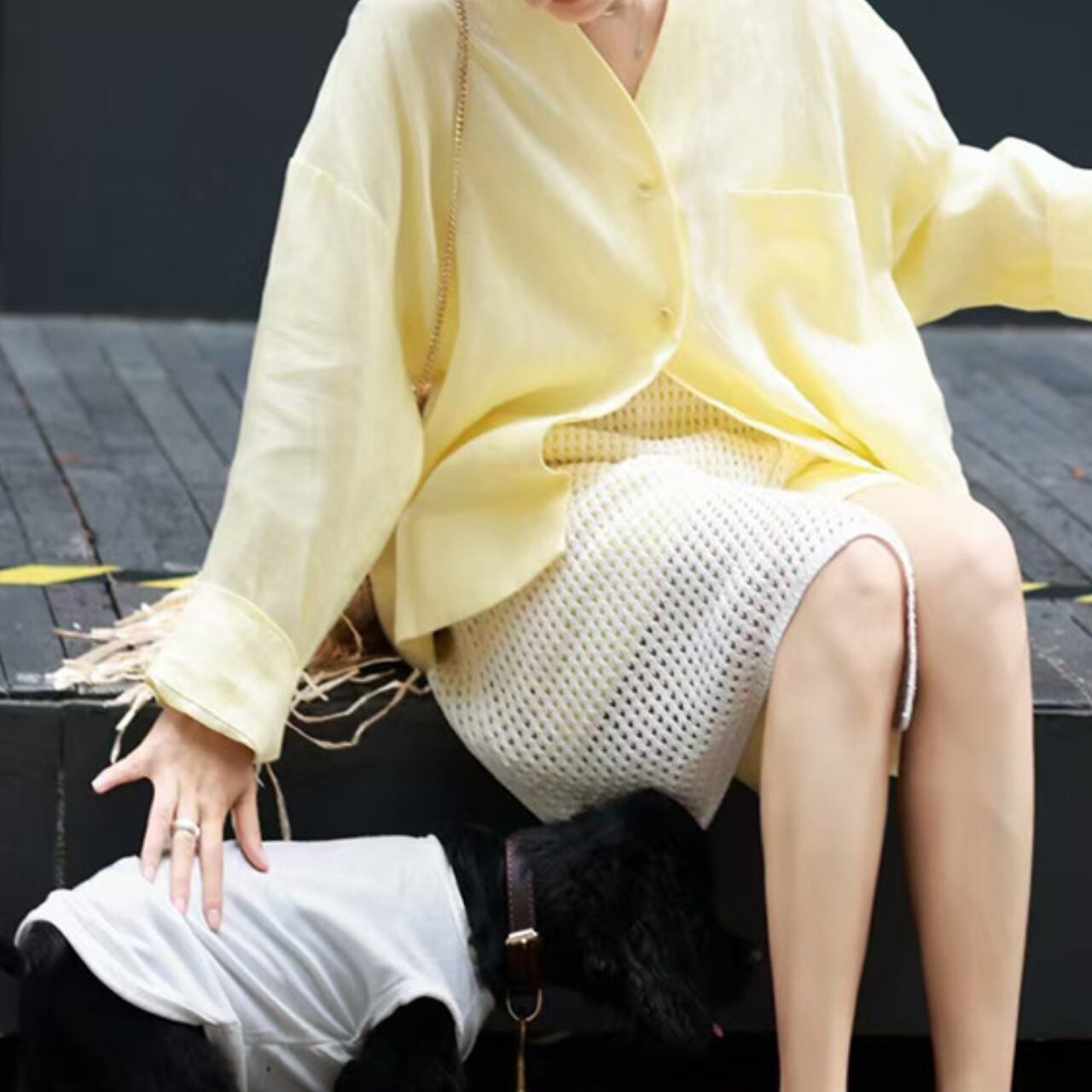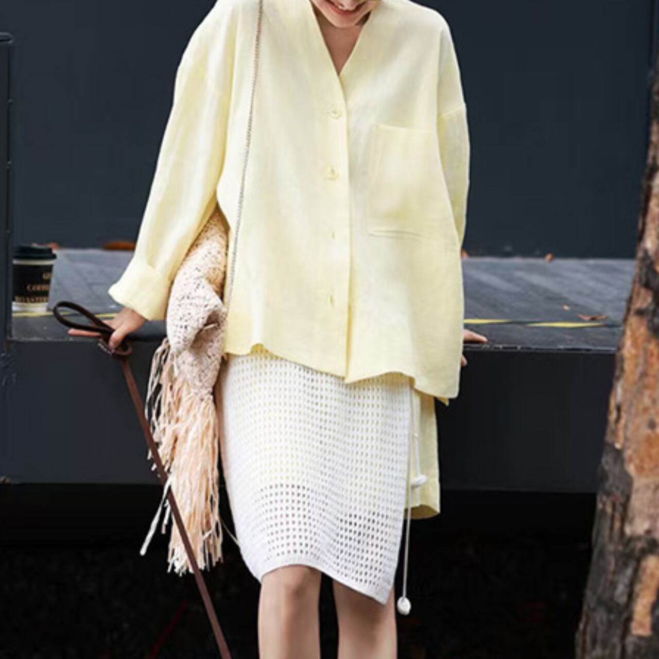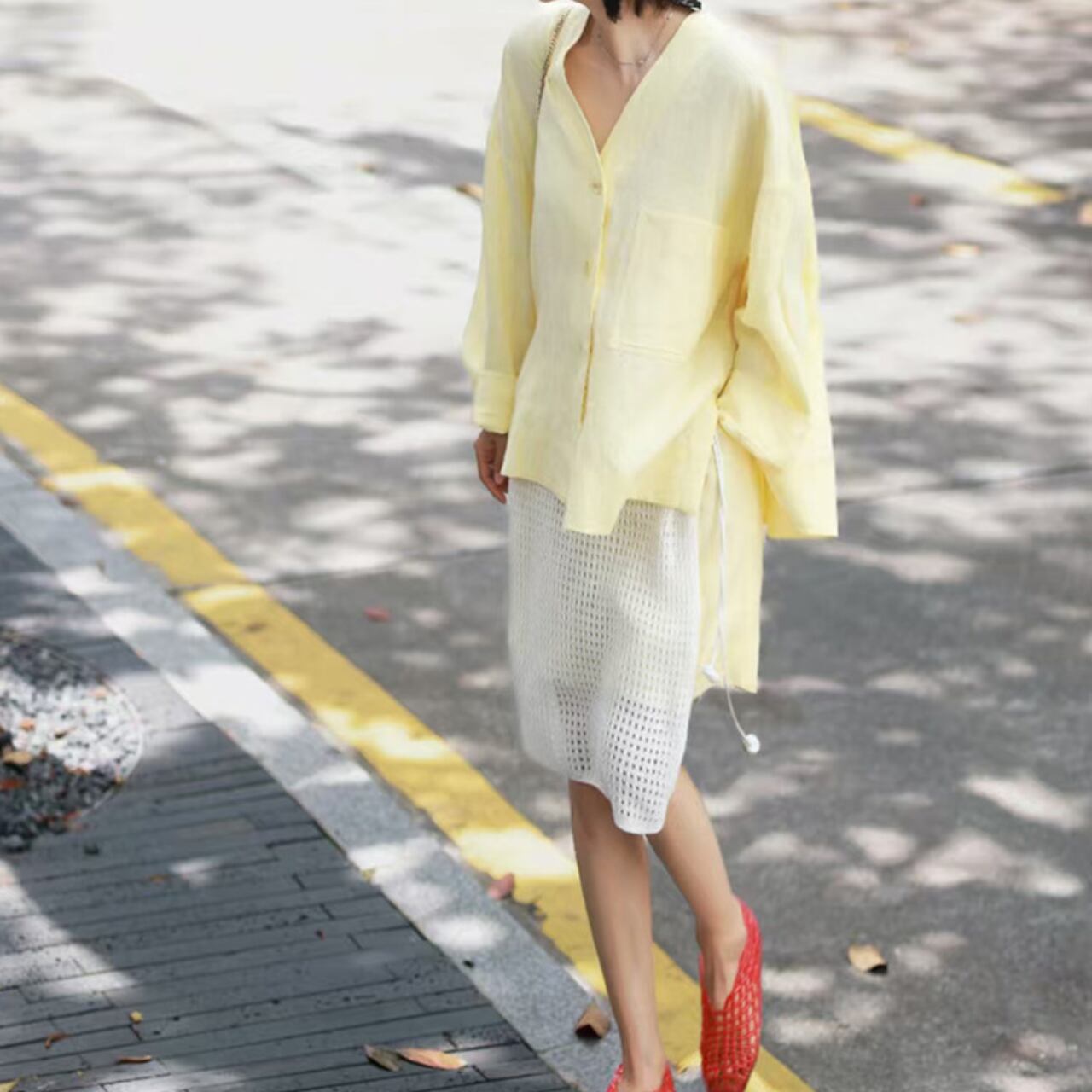 爽やかなリネン素材のシャツと、メッシュ素材を重ねたスカートが印象的なセットアップ。ほんのり透け感のある異素材レイヤードが涼しげで、春夏らしい軽やかな印象に。柔らかく優しいイエローカラーで肌なじみも良く、休日のお出かけやリゾートスタイルにもぴったり。バンダナや個性派シューズと合わせたスタイリングもおすすめです。