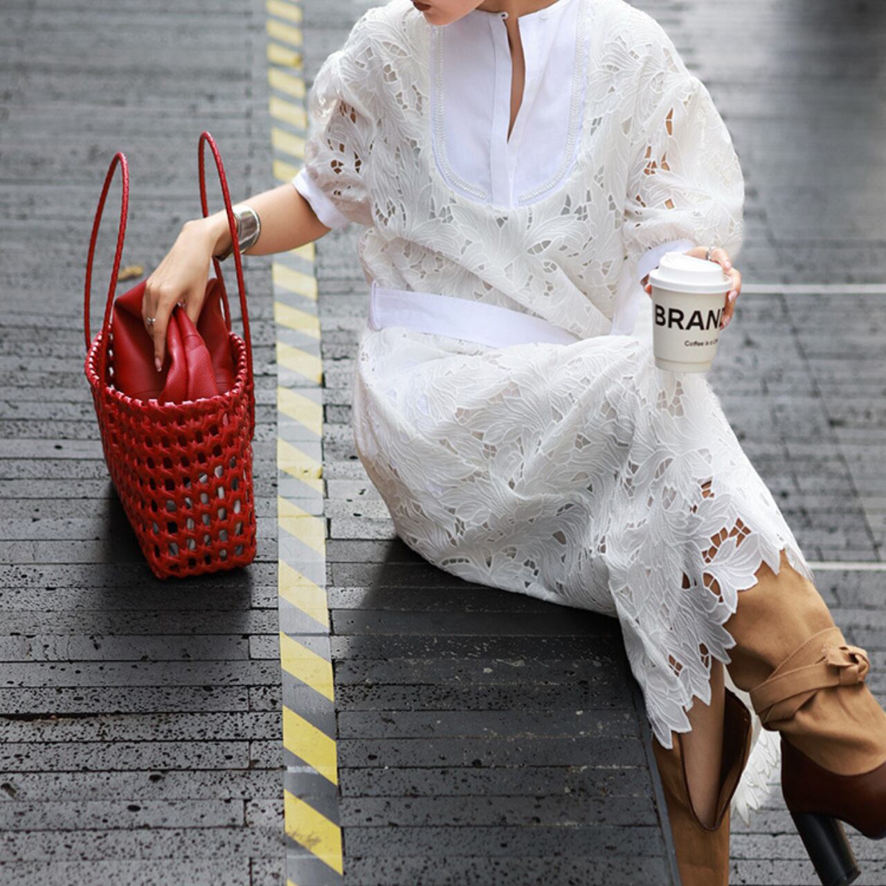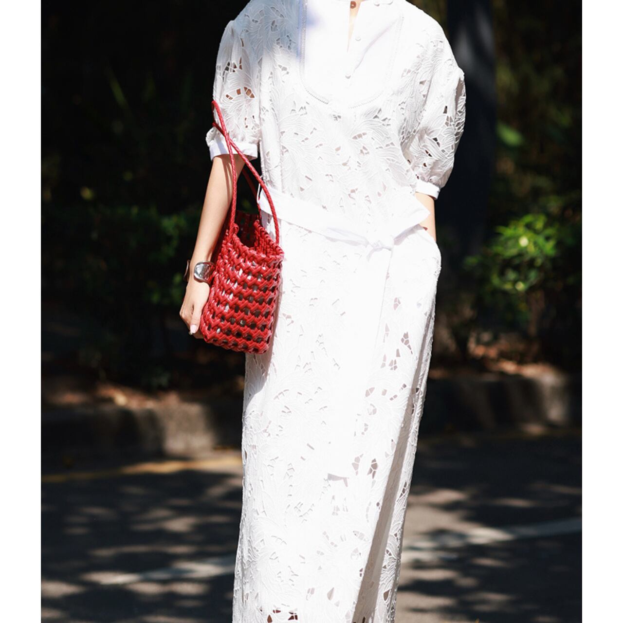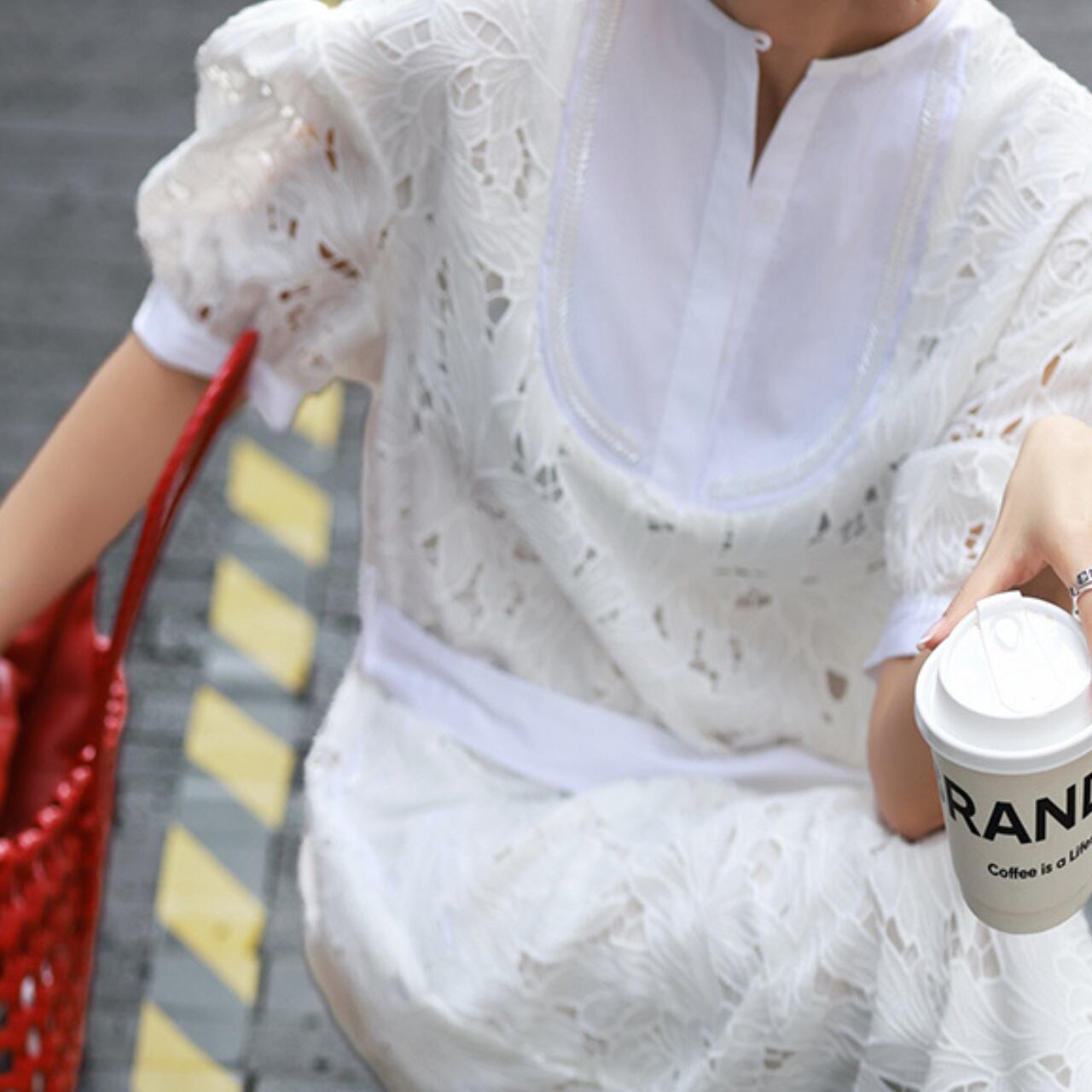 繊細なレース刺繍が上品な印象を与えるホワイトワンピース。ボリュームのあるパフスリーブとスッキリとした襟元が特徴で、ウエストのリボンでシルエットの調整も可能。軽やかな印象でカフェタイムやお出かけスタイルにぴったりの一枚です。