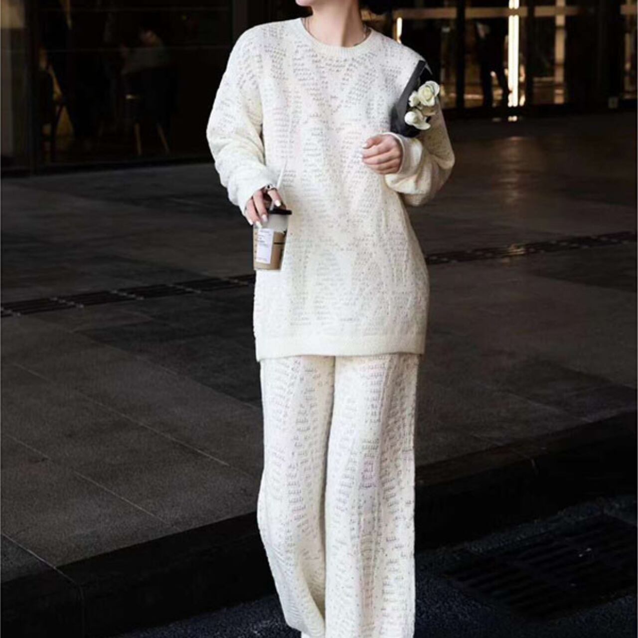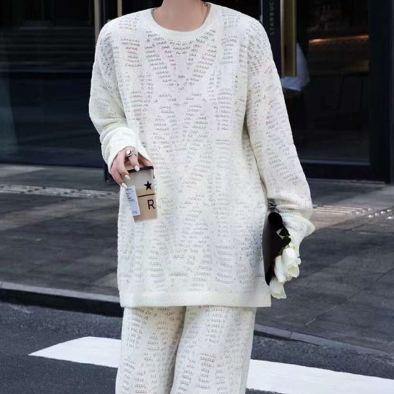 軽やかな透かし編みデザインが魅力のニットセットアップ。ルーズフィットのトップスとワイドシルエットのパンツが、リラックス感と抜け感を演出。上下セットでも単品でも着回しやすく、カフェやちょっとしたお出かけにもぴったりの大人カジュアルアイテムです。