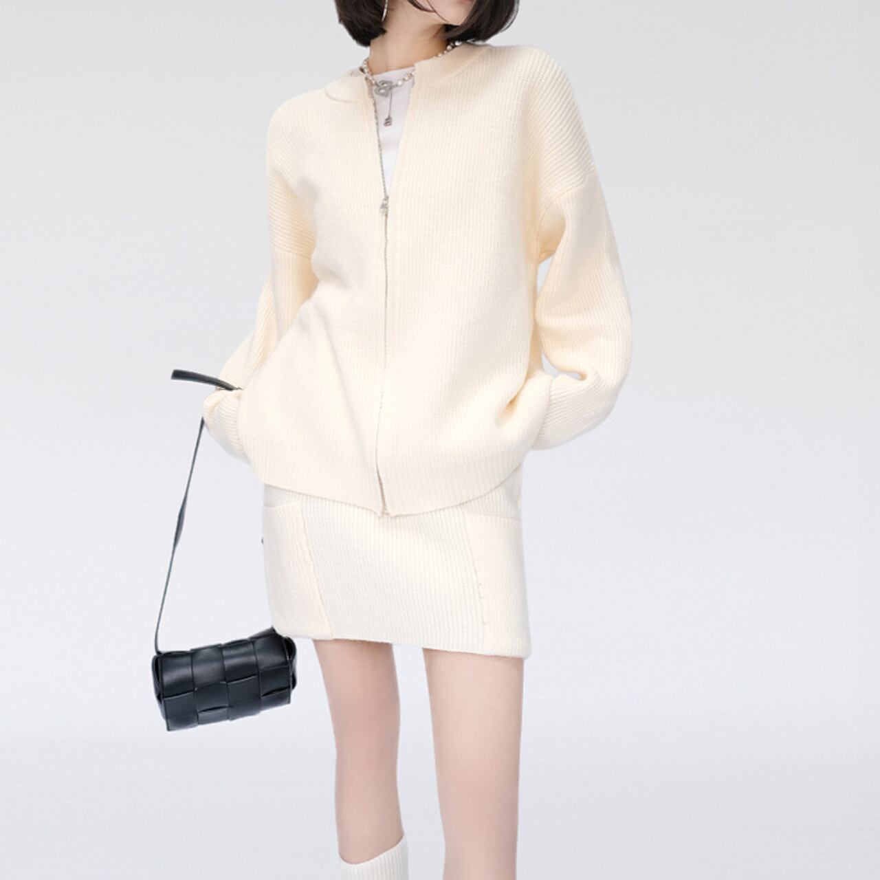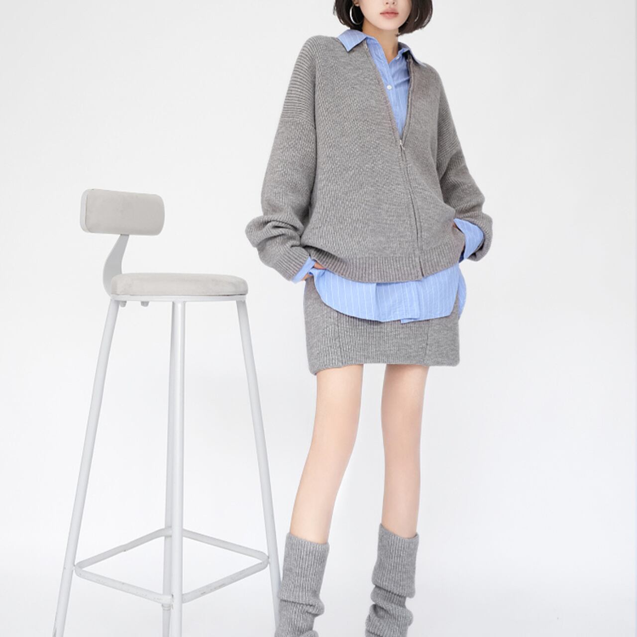 ざっくりとした編み地が魅力のニットトップスと、シンプルなIラインのミニスカートがセットになった今季注目のセットアップ。トップスはジップ仕様でレイヤードにも使いやすく、ボリューム感のあるレッグウォーマーがトレンド感をプラス。着るだけで抜け感と旬を両立する、こなれカジュアルなスタイルが完成します。