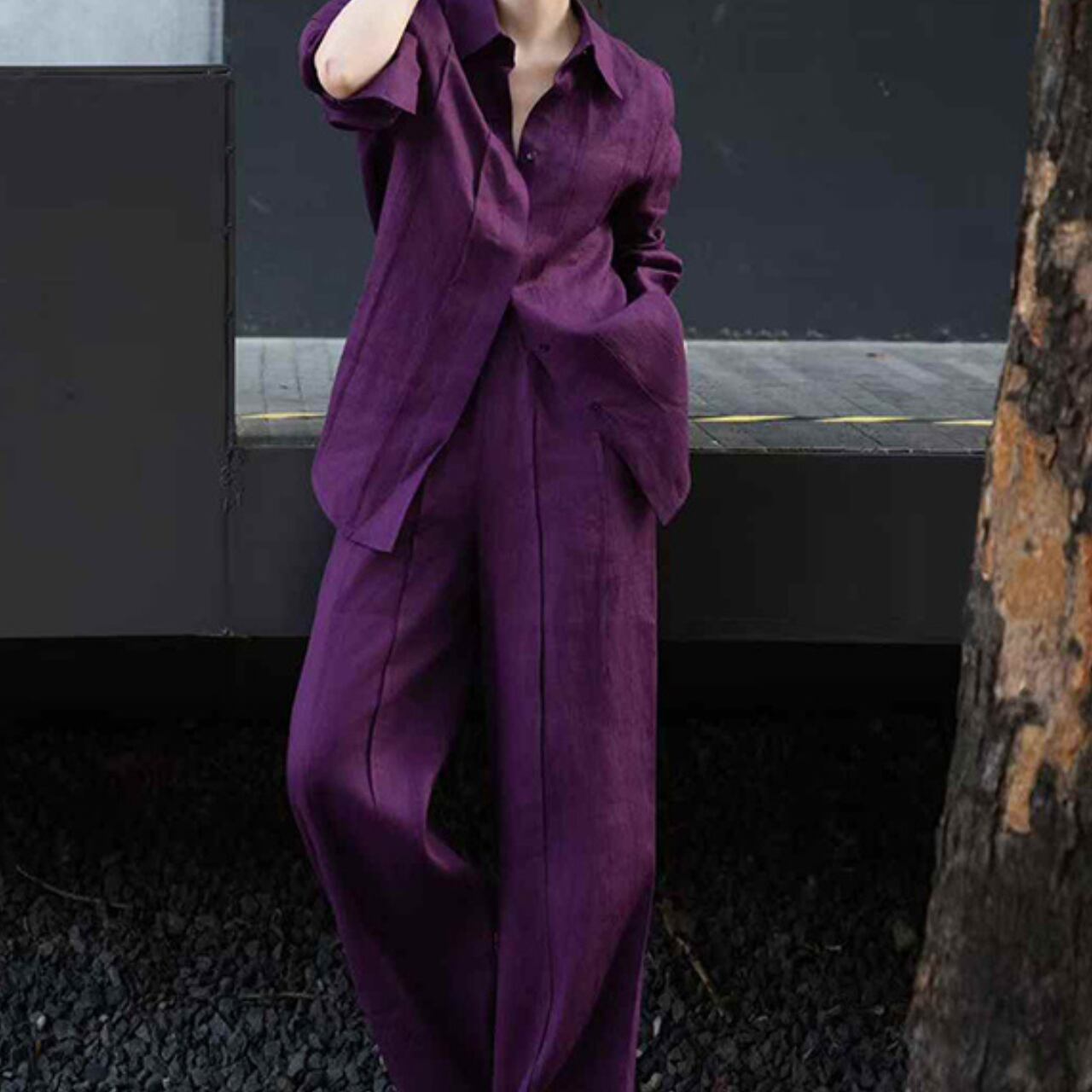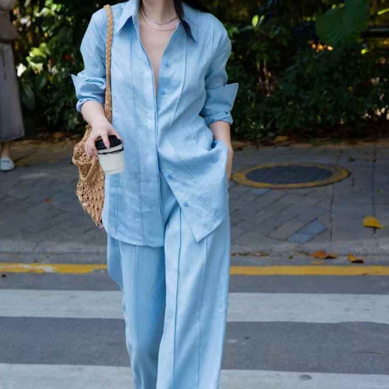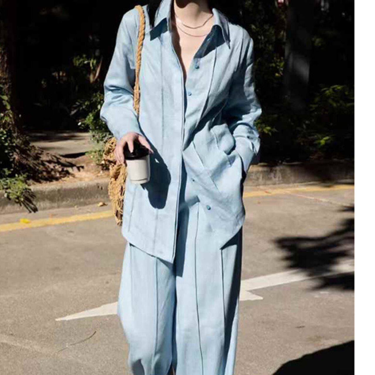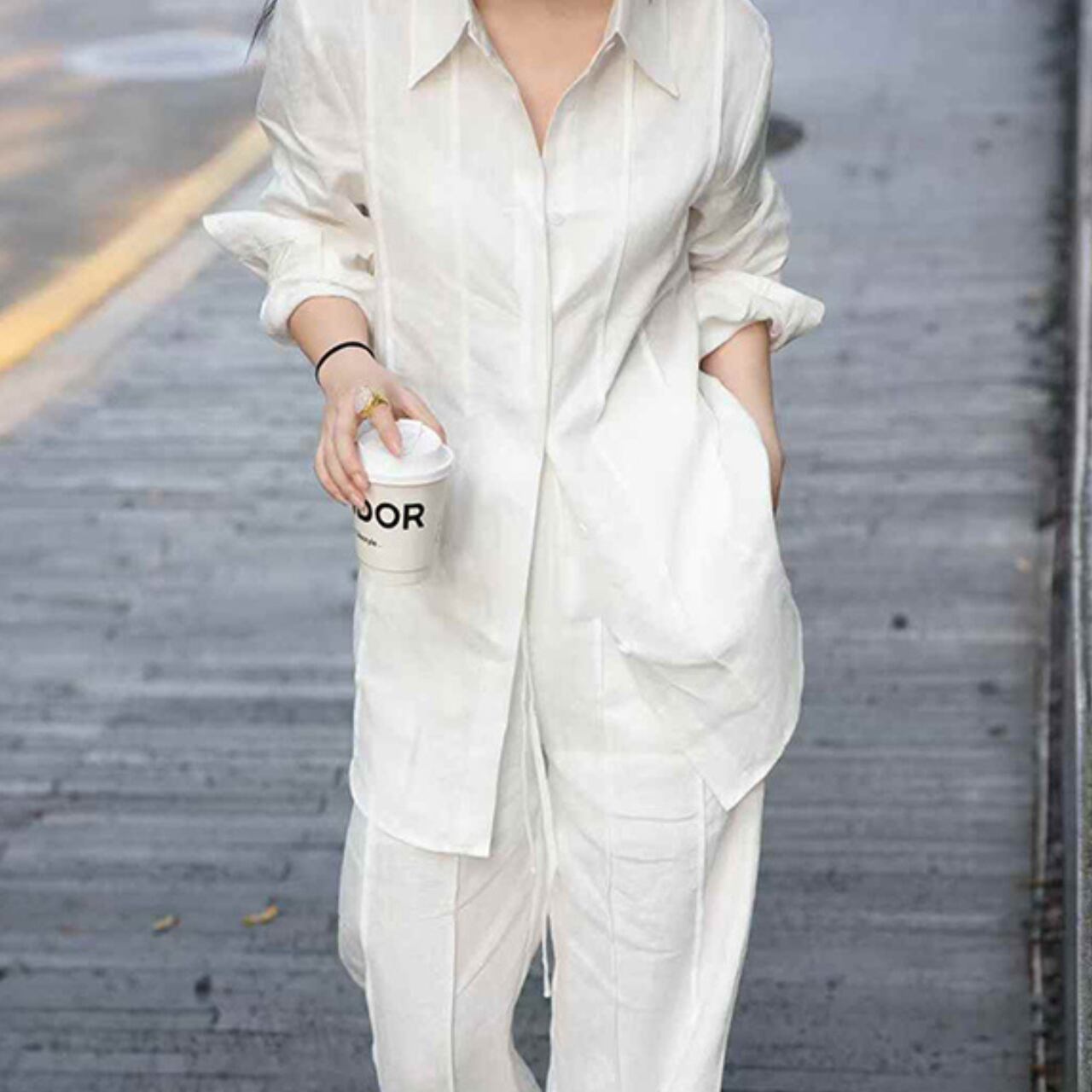 軽やかなリネン風素材を使用したルーズシルエットのシャツ&パンツセット。程よいハリ感と柔らかさがあり、ナチュラルで大人っぽい印象に仕上がります。シャツはヒップを覆う丈感で、ボトムとのバランスも抜群。セットでも単品使いでも着まわせる、デイリーに活躍する一着です。