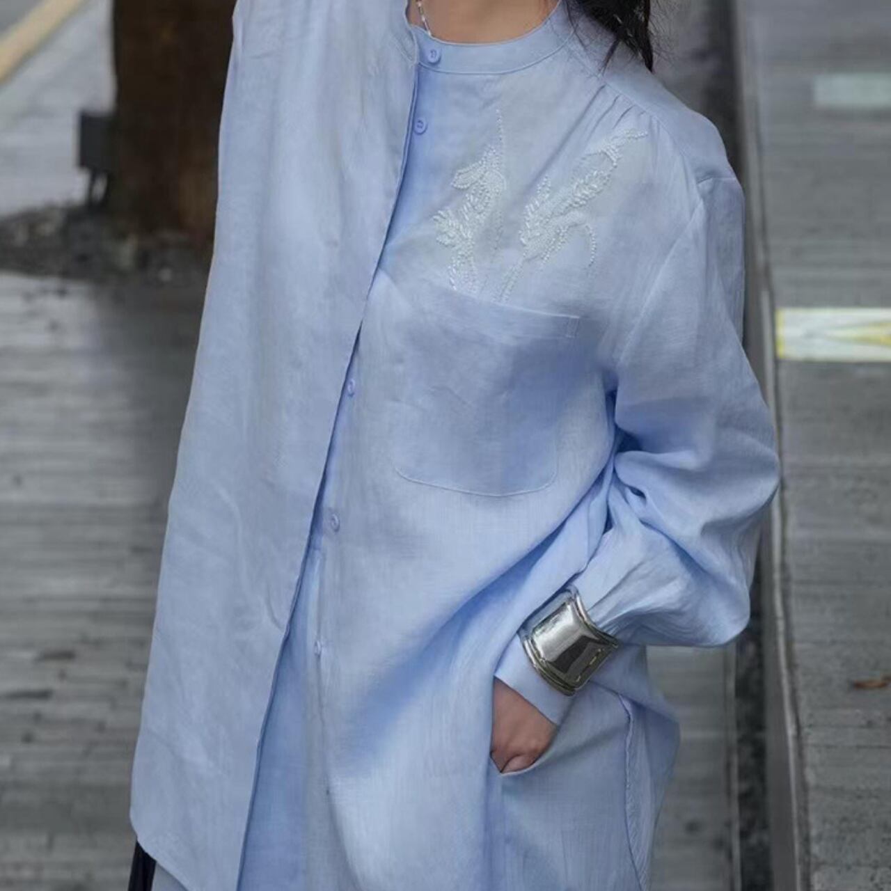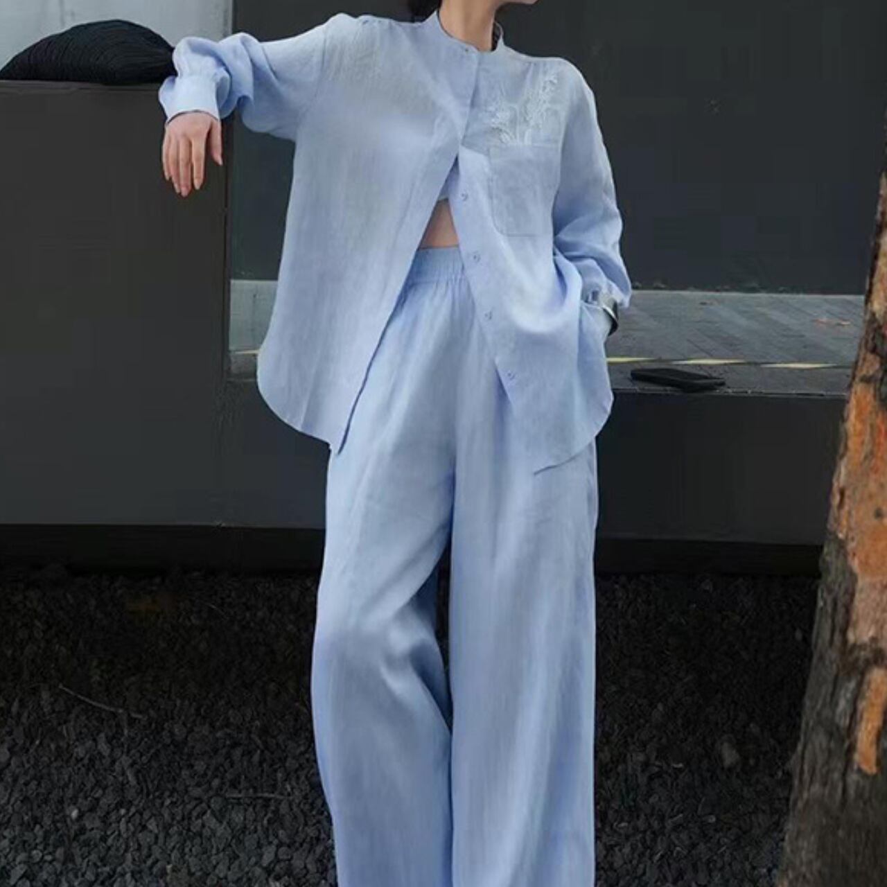 #リネン風 #バンドカラーシャツ #ルーズセットアップ #リラックスコーデ #ワイドパンツ