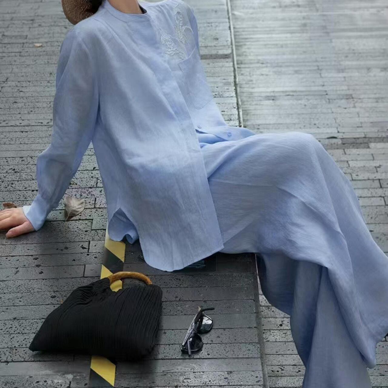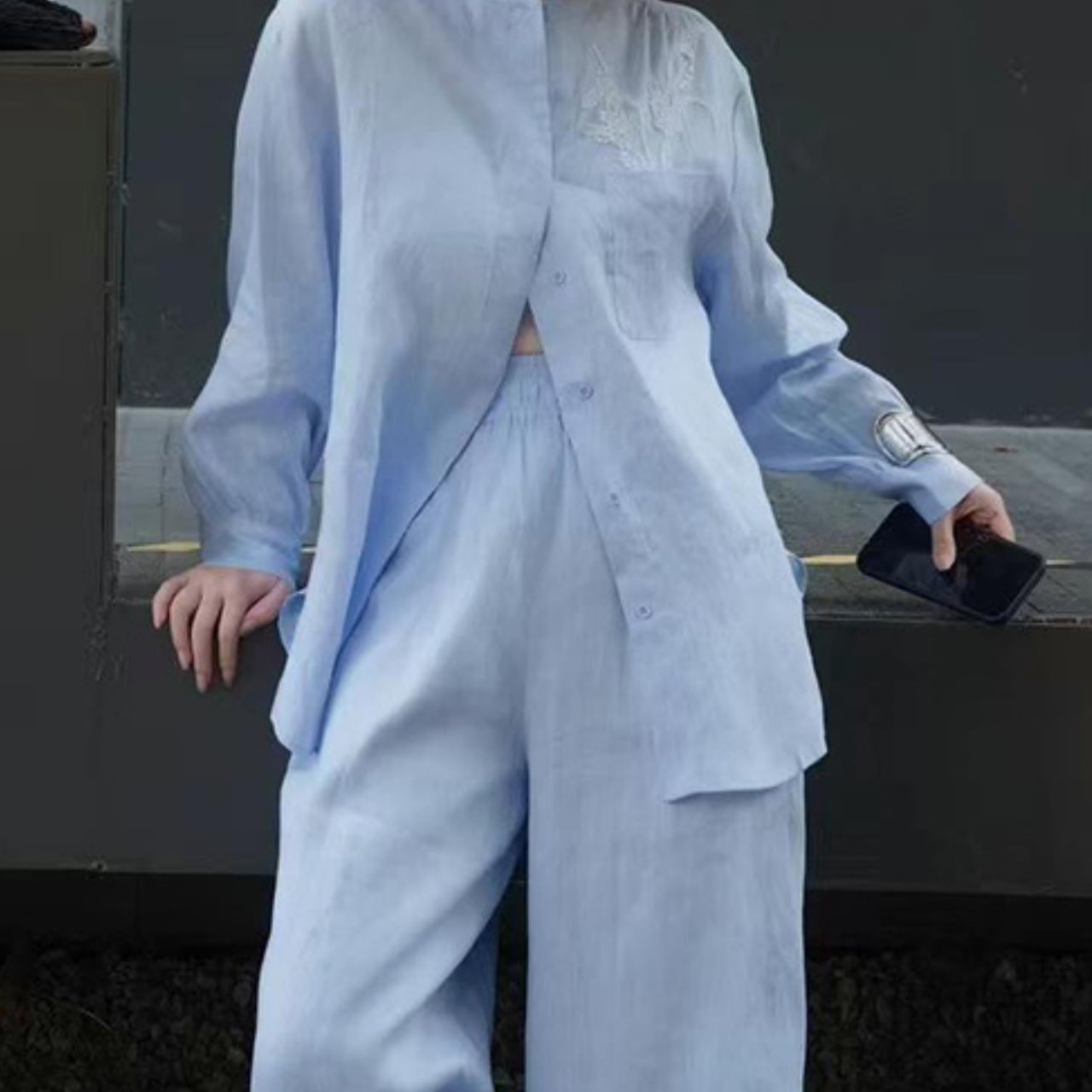 ライトブルーが上品な印象を与えるリネン風素材のセットアップ。ゆったりとしたルーズシルエットで、リラックスした大人カジュアルスタイルを演出。シャツは程よく長めの丈感で体型カバーも叶い、パンツはワイドストレートで美脚効果も◎。シンプルながらもこなれ感のあるデザインで、デイリーからリゾートシーンまで幅広く活躍します。