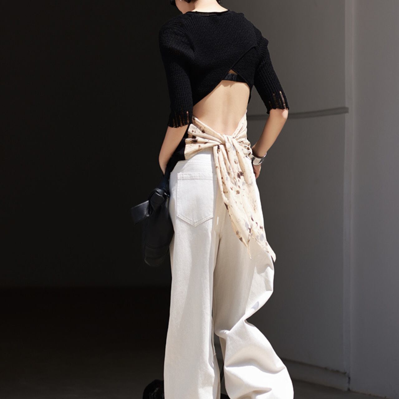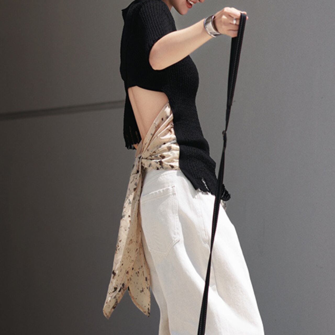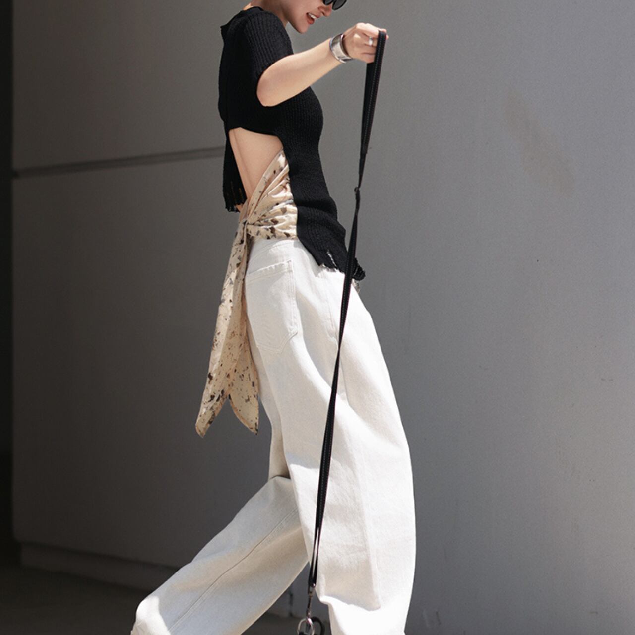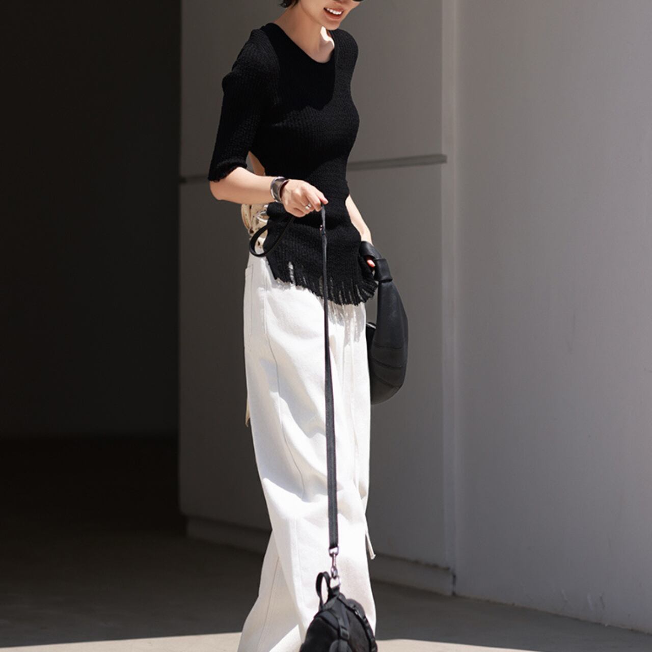 タイトなシルエットながら伸縮性のあるニット素材で着心地抜群のトップスは、裾のフリンジとサイドスリットが動きに軽やかさをプラス。シンプルながらも個性的なデザインが魅力。ゆったりとしたシルエットのホワイトワイドパンツと合わせて、大人の余裕漂うモードカジュアルスタイルに。