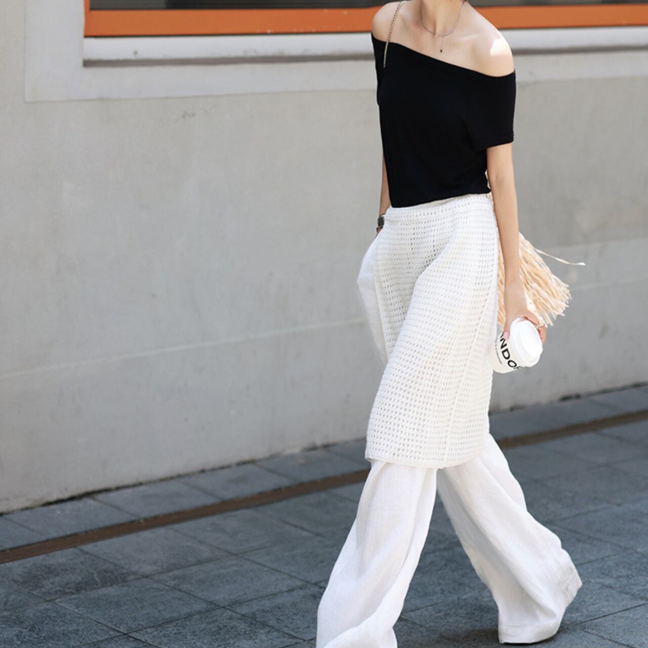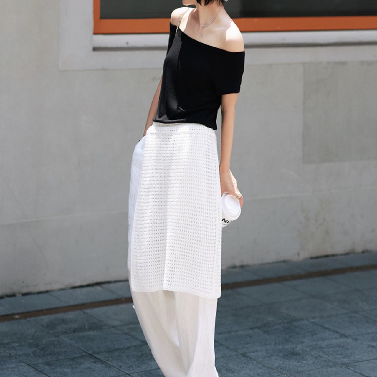 抜け感のあるオフショルダーニットトップスと、レイヤード風の編みニットスカートが重なったようなワイドパンツのセットアップ。ブラック×ホワイトのモノトーン配色がシンプルながら洗練された印象を与え、大人カジュアルからリゾートスタイルまで幅広く活躍します。