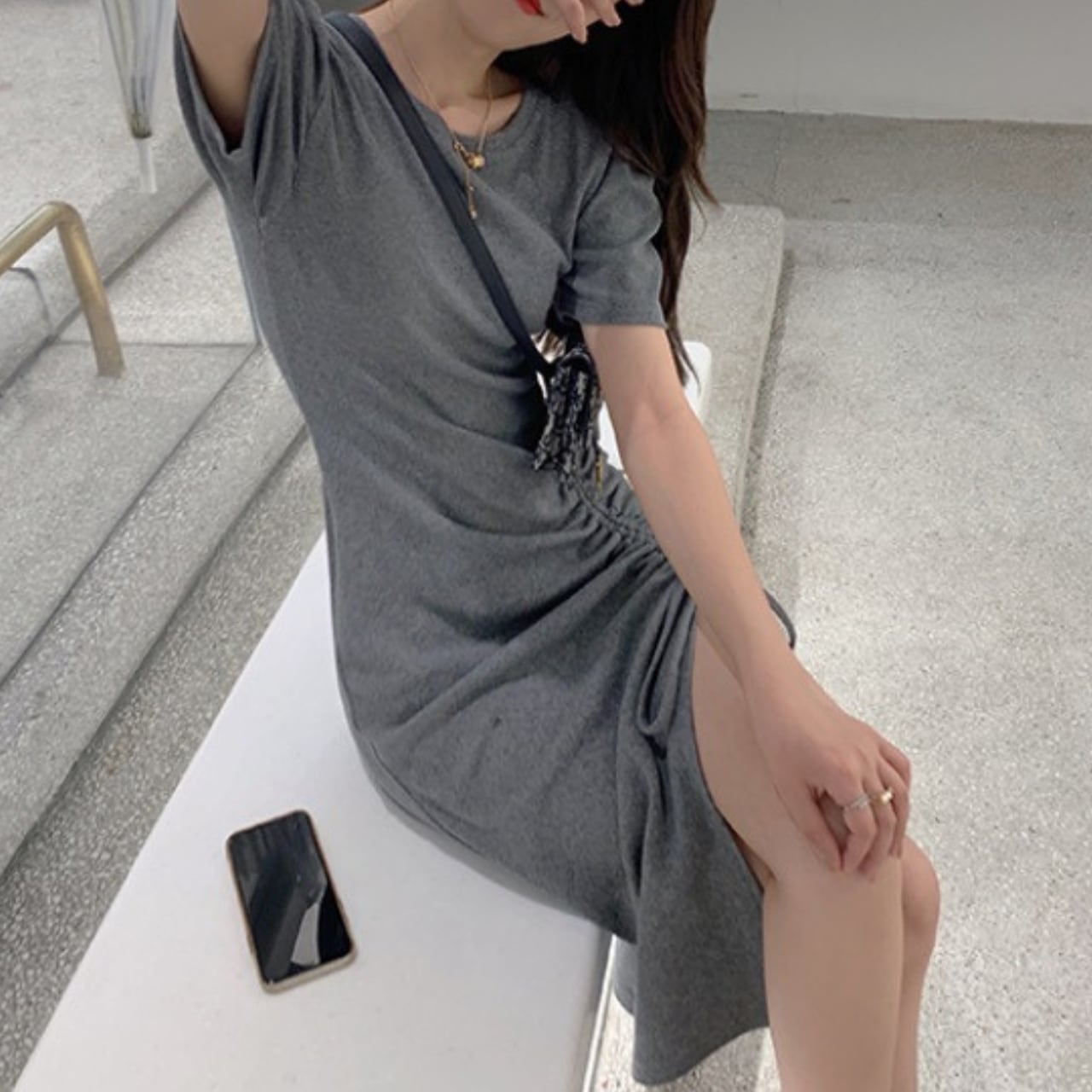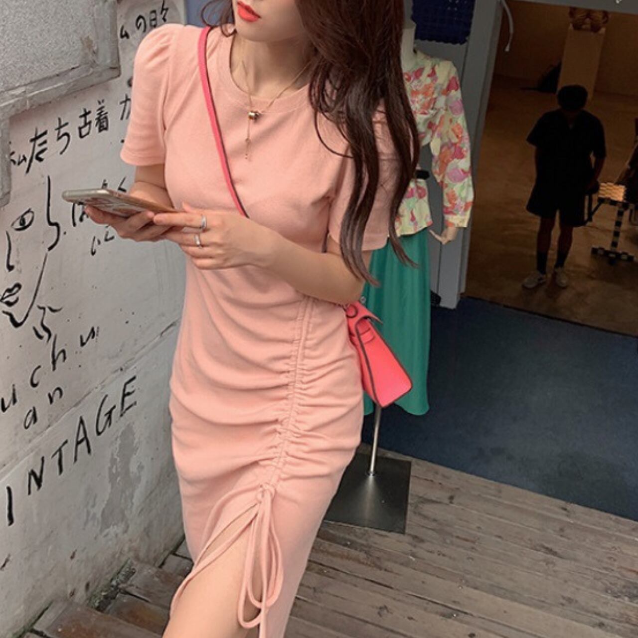 サイドのギャザーとドローストリングがアクセントになったフェミニンな半袖ワンピースです。柔らかく伸縮性のある素材で着心地抜群。スリムなシルエットを演出しつつ、華やかさもプラス。ピンクは若々しく明るい印象に、グレーはシンプルで落ち着いた雰囲気で長く愛用いただけます。