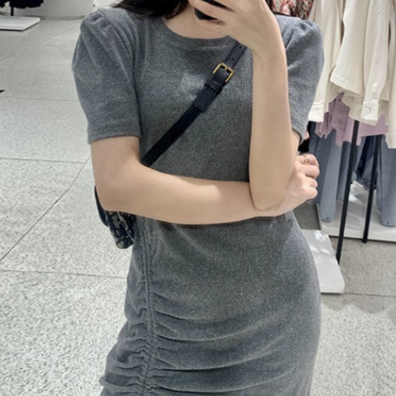 #ギャザーワンピース #半袖 #ピンク #グレー #フェミニン
