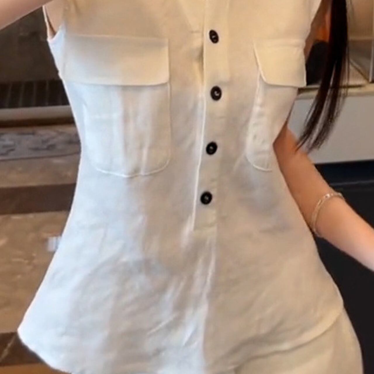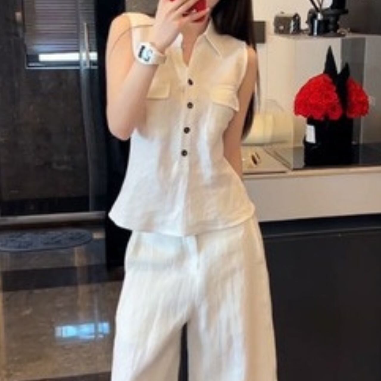 大人の抜け感を演出する、涼しげなノースリーブシャツとワイドパンツのセットアップ。柔らかく軽やかな素材で、リラックスしながらもきちんと見えする一着。リゾートスタイルや街歩きにもぴったりな万能コーデです。